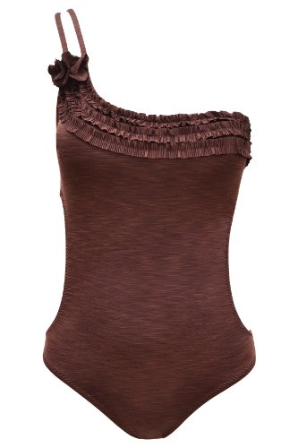 Asymmetrical one piece features a fashion forward asymmetrical neckline, adjustable strap, and ruffle detailing. Clips at the back.You will not be disappointed with Betsey Johnson Shortcake Asymmetrical One Piece